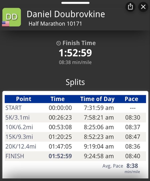 Perfect half, first since my marathon injury. Felt great!